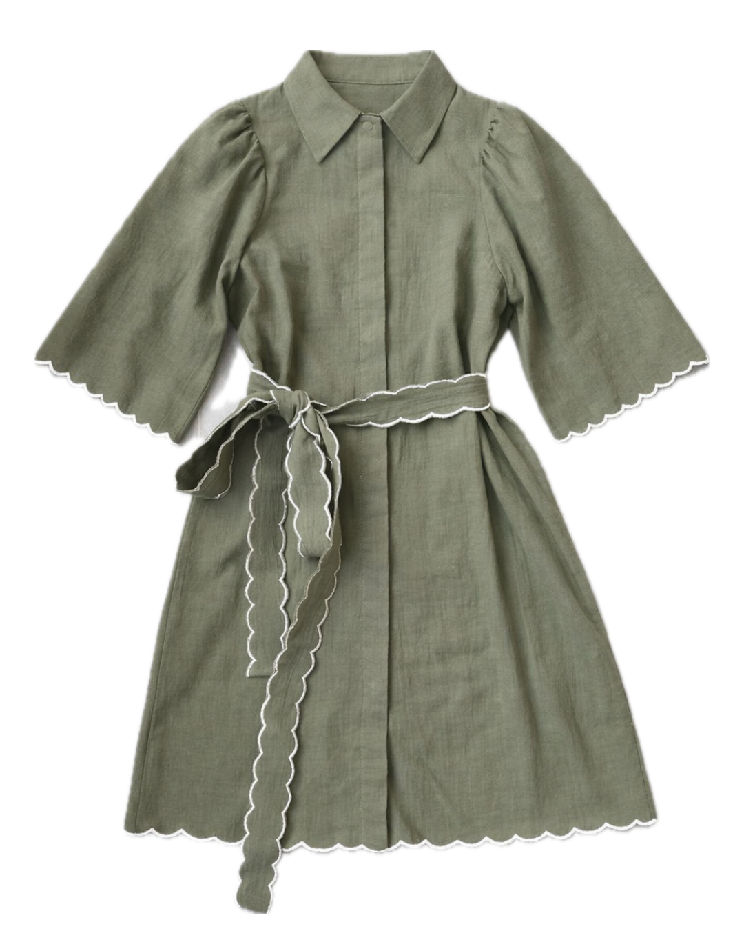 With the adjustable self waist tie to cinch and style your way, this mini dress with collar, short sleeves and mini length and adorned with embroidered scalloping detailing, will effortlessly take you from desk to dinner date and into the weekend.